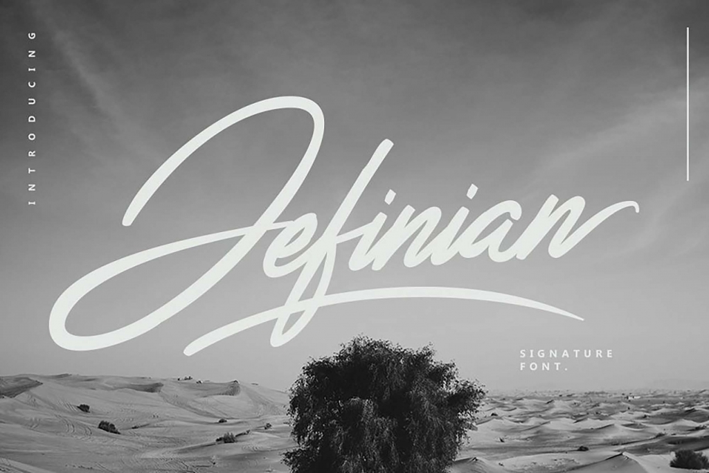 Jefinian, created by Sizimon, is a bold script handwritten style font holding sophisticated designs with a set of uppercase and lowercase letters, punctuations, and numerals with multilingual support. Find harmony within each character and stroke, discover its swashes and alternates, and use it for branding and packaging designs, business cards, flyers and posters, apparel items, stationery presentations, social media posts and cover pictures with quotes, invitation cards, apparel items and accessories ads, etc. Presented in TTF format, this is a free version with limited features that can only be used for personal purposes.